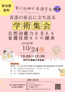 日 時:2026年10月24日(土) 10:00~12:30 テーマ:看護の原点に立ち返る-自然治癒力を支える看護技術とその継承ー 集会長 :内山孝子(神戸市看護大学基盤看護学領域基礎看護学分野准教授) 場 所:神戸市看護大学西館 内 容:会長講演/記念講演/演題発表