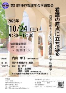 日 時:2026年10月24日(土) 10:00~12:30 テーマ:看護の原点に立ち返る-自然治癒力を支える看護技術とその継承ー 集会長:内山孝子(神戸市看護大学) 場 所:神戸市看護大学西館 内 容:鼎談/集会長講演/一般演題/ポスター発表/交流集会